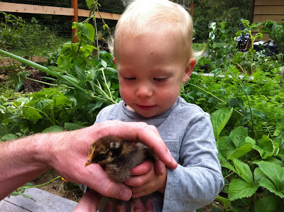 The chickens now have an outdoor coop (and we have the garage back - they were living in a dryer box on it's side in there) They are officially 6 weeks old and plenty hardy enough to venture outside in all weather. The box is closed in for now, but they have access to the yard from the front door which will be closed at night, and will have access to a fenced in run from a back door. And we can maintain and access them from the roof and side door - without having to go into the run. Matt is glad he bought a contractors box of hinges. Gates and doors abound!